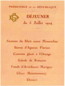 À cette occasion, un déjeuner est offert au Palais de l’Élysée en l’honneur du Prince de Galles. Le menu de ce déjeuner, reproduit ci-contre, porte le monogramme « GD » pour Gaston DOUMERGUE.