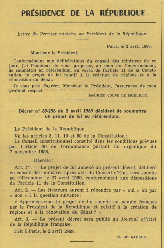 Décret n° 69-296 du 2 avril 1969 décidant de soumettre un projet de loi au référendum - Consultable sur Légifrance