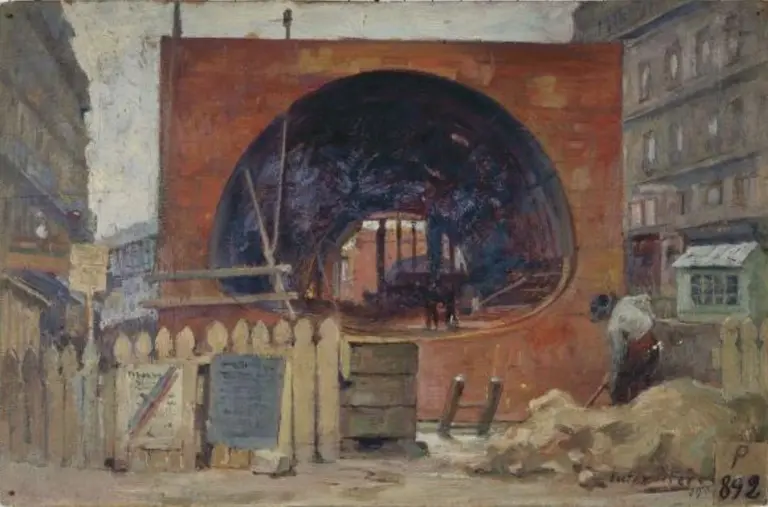 Parisien dans l’âme, Victor MAREC témoigne des transformations que la capitale connaît depuis le second Empire, accentuées par les travaux de l’exposition universelle de 1900. Les projets se multiplient, dont le plus innovant est celui du Métropolitain : il peint alors le chantier de l’ouverture de la ligne 4.